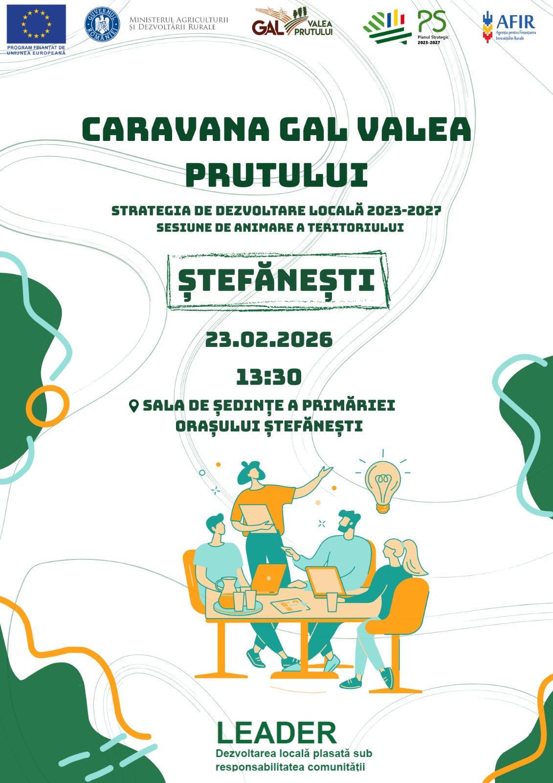 Invităm persoanele interesate să depună proiecte în viitoarele apeluri de finanțare să participe la întâlnirea de animare organizată în data de 23.02.2026, oraș Ștefănești. Vor fi prezentate ghidurile revizuite pentru intervențiile dedicate mediului privat non-agricol, mediului de afaceri și cooperativelor cu cofinanțare, precum și recomandări pentru elaborarea unor proiecte fezabile și ușor de implementat.